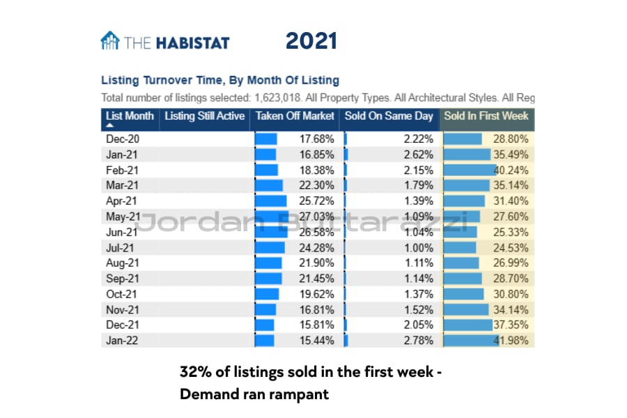 In 2021, a massive share of listings cleared in the first week. Bidding wars became a ‘strategy’ for every listing, speed became the norm, and it wasn’t abnormal for folks to buy properties without seeing them.
