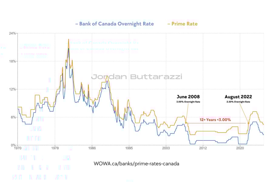 For additional context, Canada’s overnight rate hit 3.00% in June 2008 and then stayed below that level for more than 12 years. That era ended abruptly in mid-2022 as borrowing costs rose at the fastest pace in decades. It was a dramatic reversal after more than a decade of ultra-low interest rates that helped reinforce the idea that “real estate only goes up.”