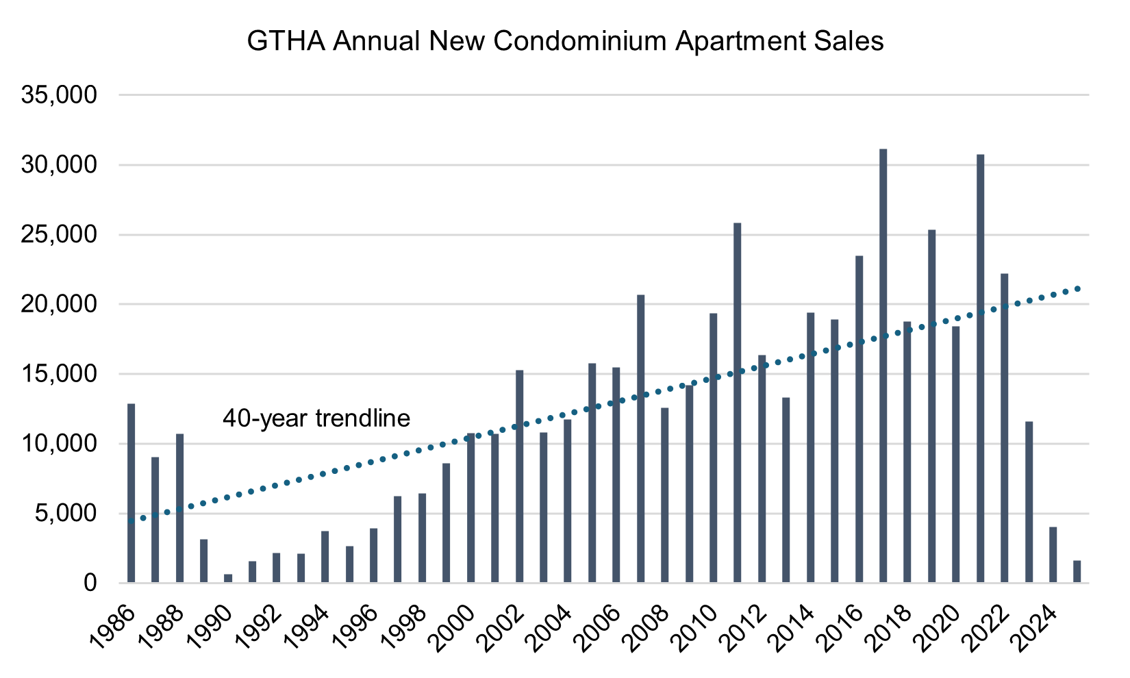 After two major peaks in 2017 (31,216 sales) and again in 2021 (30,844 sales), new condo sales fell by roughly 95% by 2025… with the sharpest declines coming from 2023 to 2025.